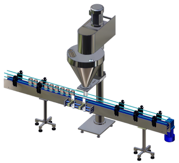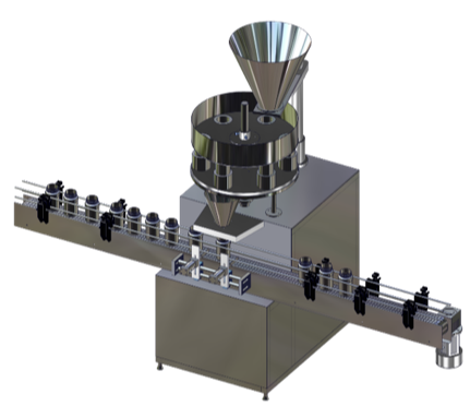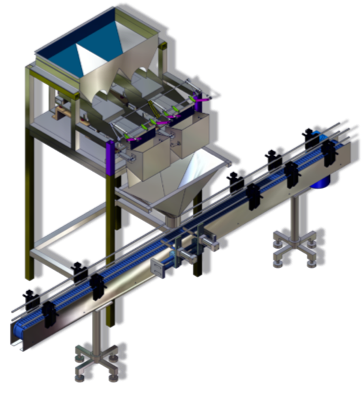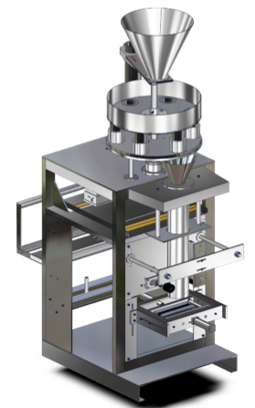 ماشین دارای قیف 50 لیتری از جنس استنلس استیل بوده و میتواند دارای همزن نیز باشد. حجم پیمانهها تعیین کننده وزن محصول نهایی میباشد. قابلیت تنظیم حجم وجود دارد. این دستگاه میتواند با کانوایر و بدون کانوایر طراحی و ساخته شود.
